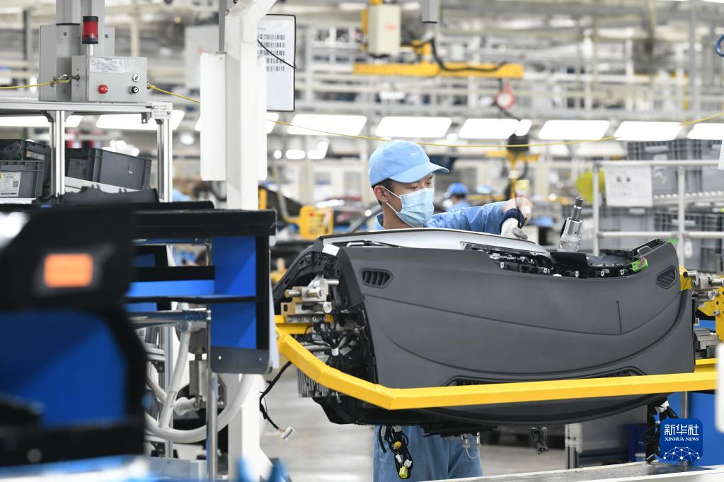 6月7日,上汽集团乘用车宁德基地总装车间,工人装配汽车仪表中控。