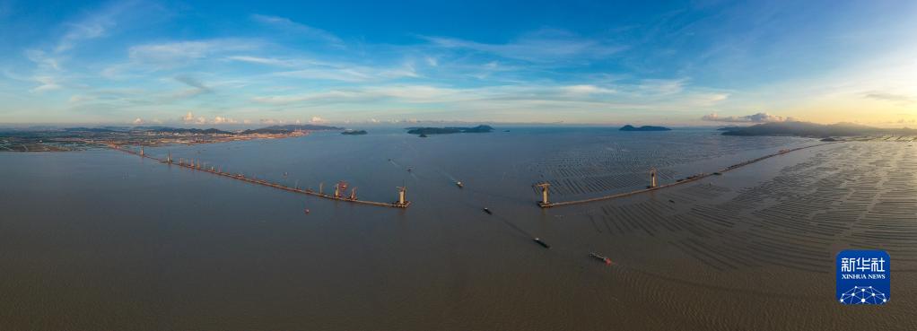 正在建设中的黄茅海跨海通道横跨珠江口崖门入海口(6月27日摄,无人机全景照片)。