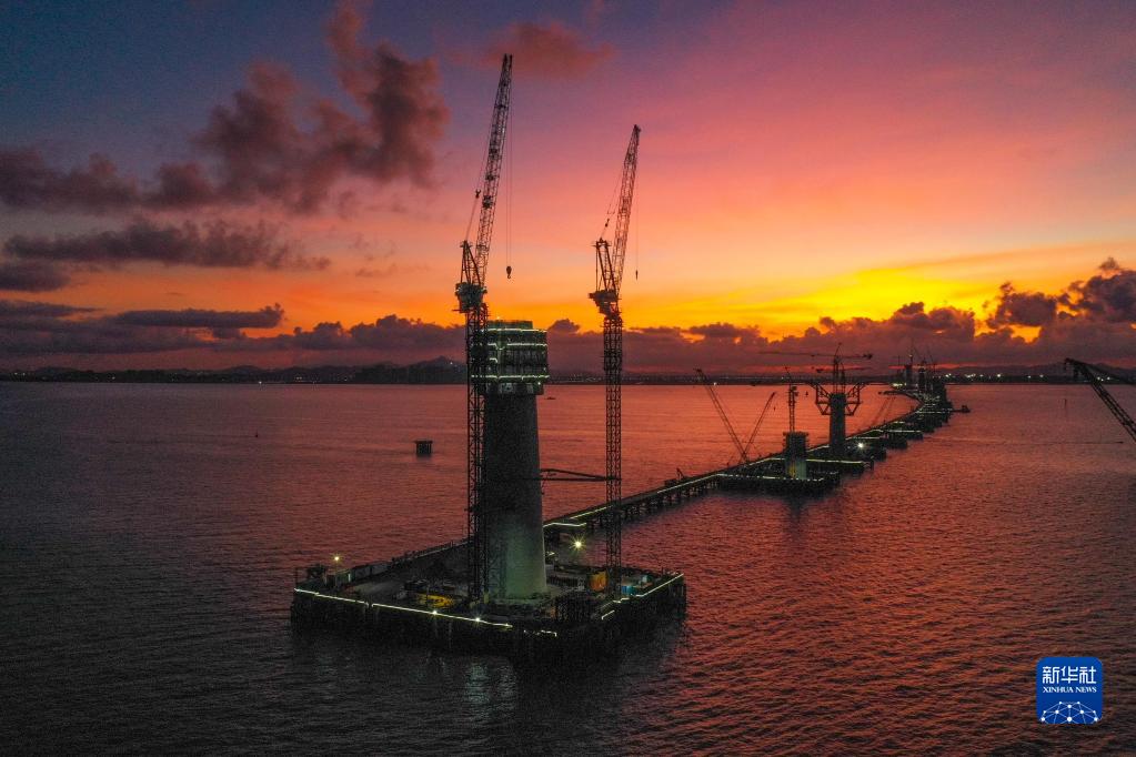 晨曦中的黄茅海大桥东塔(前)(6月28日摄,无人机照片)。