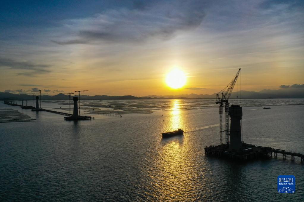 夕阳下的黄茅海大桥三座塔柱(6月27日摄,无人机照片)。