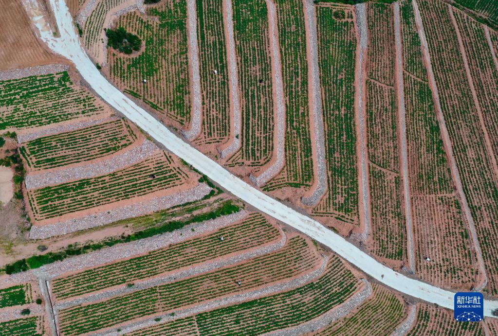 6月27日,河北省卢龙县石门镇霍家沟村的村民在新改造的梯田上管护农作物(无人机照片)。