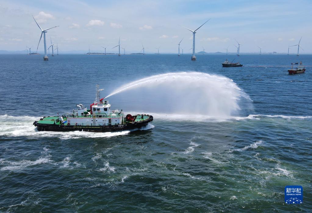 6月28日,参演单位的拖船喷洒水雾(无人机照片)。