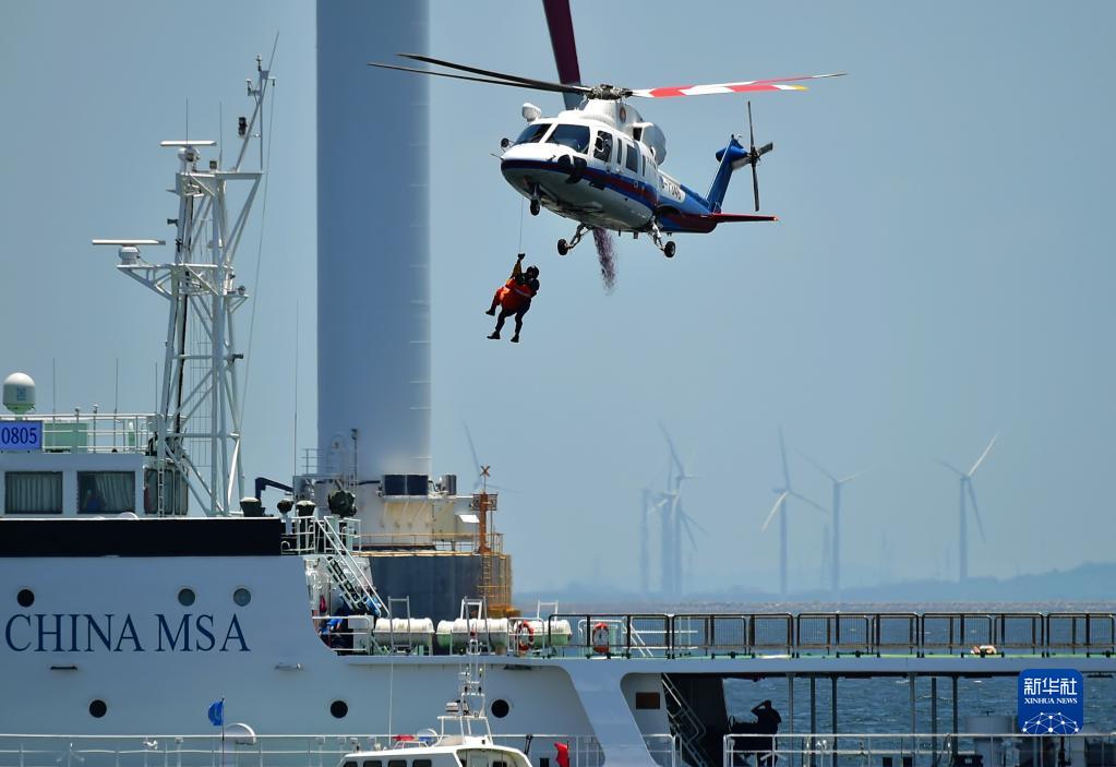 6月28日,参加演练的交通运输部东海第二救助飞行队直升机转移“中毒”的船员。新华社记者 魏培全 摄