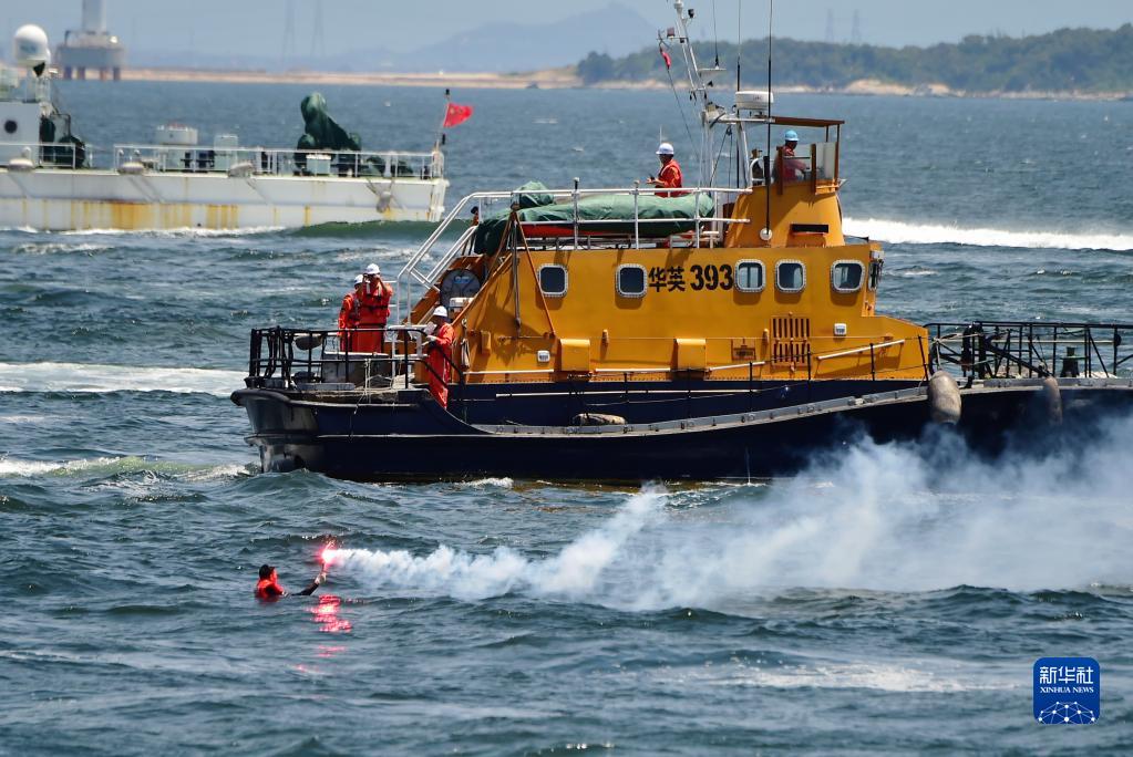 6月28日,参加演练的“华英393”救助艇准备救助“落水”船员。新华社记者 魏培全 摄