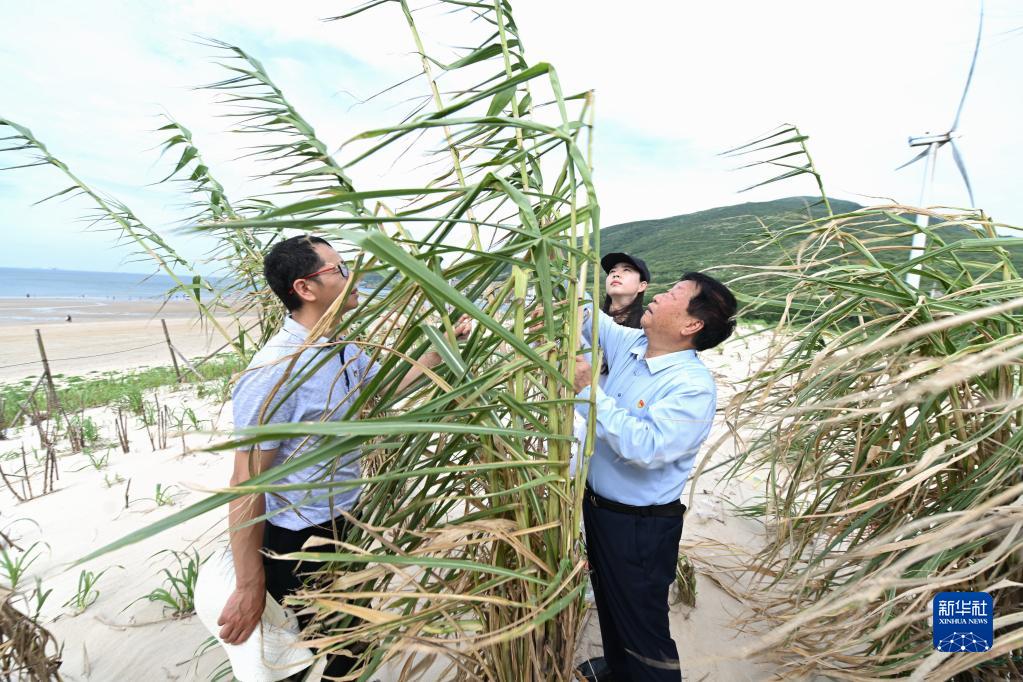 6月19日,林占熺研究员(右一)到平潭长江澳沙滩菌草固沙现场调研菌草生长情况。新华社记者 林善传 摄