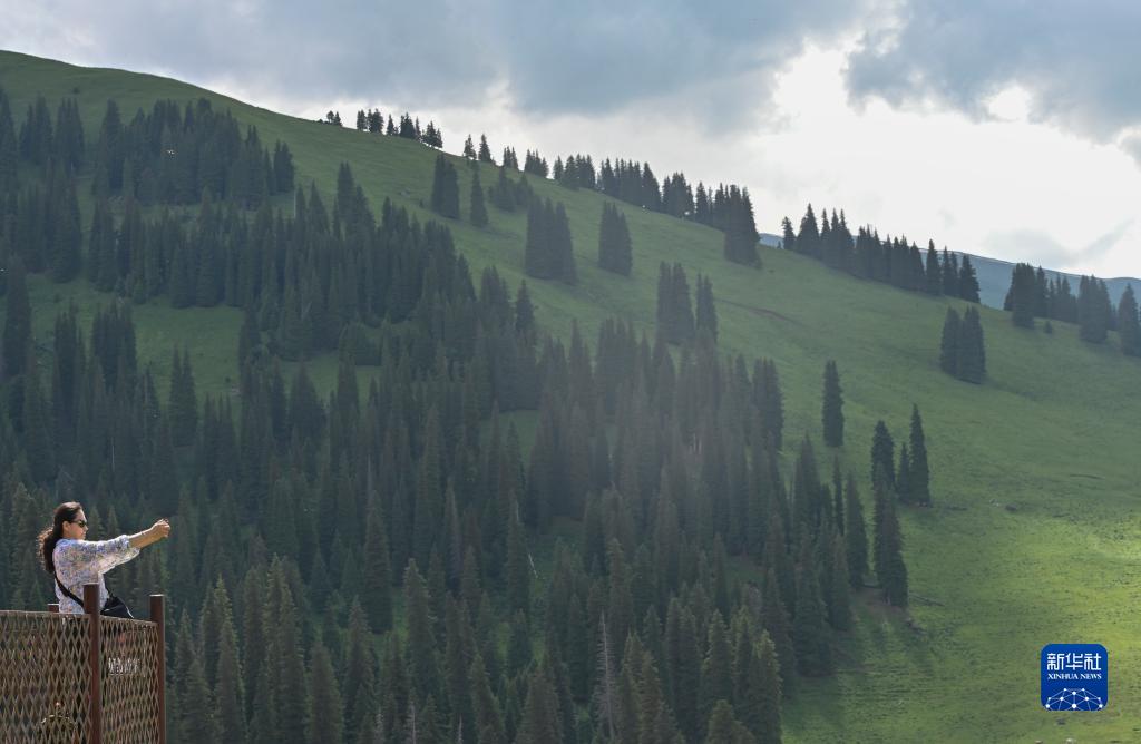 6月28日,游客在那拉提旅游风景区拍照。