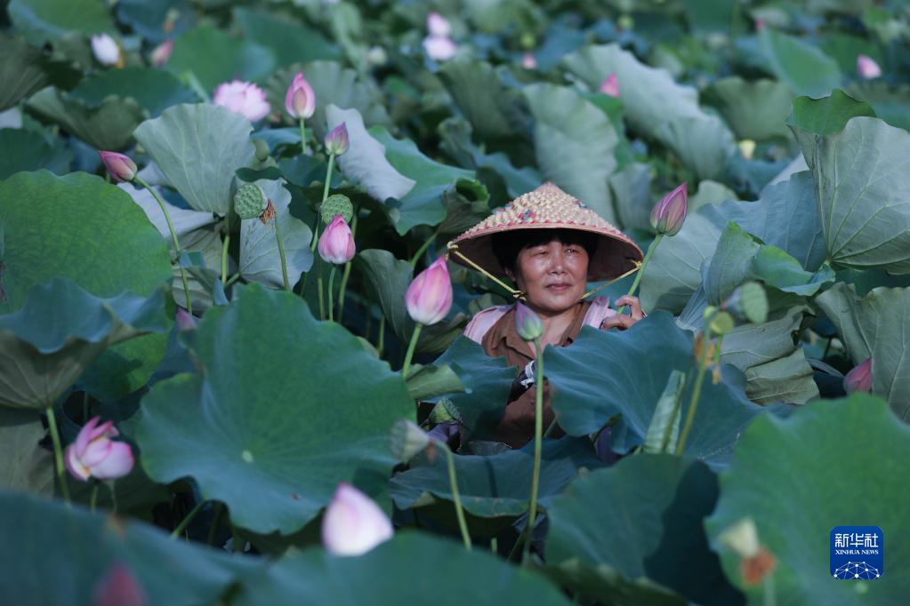 6月29日,大慈岩镇里叶村的莲农们在荷田里采摘荷花和莲蓬。