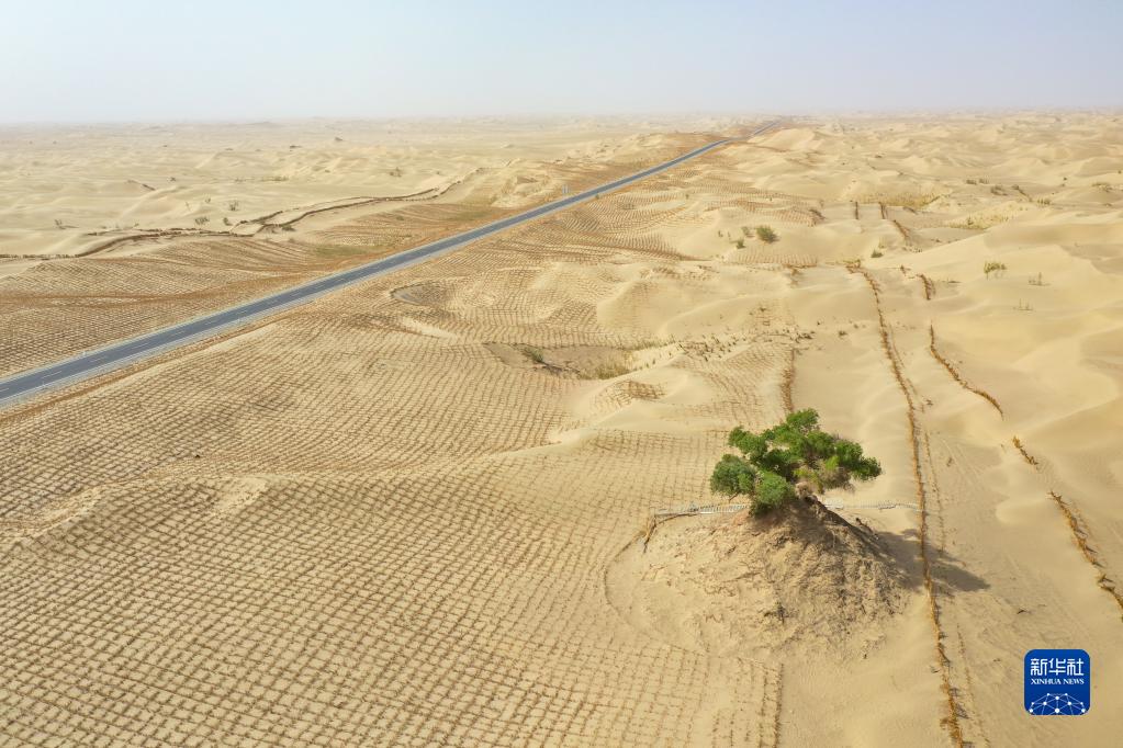 6月26日拍摄的尉犁至且末沙漠公路和建设者沿途保护的胡杨(无人机照片)。