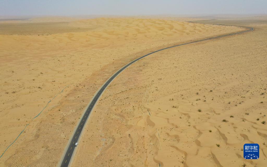 这条沙漠公路于2017年10月开工。建设者克服沙漠地区高温、缺水缺电、沙尘暴多发等实际困难,攻克一系列沙漠筑路技术难题,同步推进环境保护、风沙防护与公路建设——保护湿地、胡杨林等稀缺原始生态的同时,沿线采取“草方格+阻沙障”的方式,用芦苇、尼龙网建立起立体化、多层次阻沙体系,降低风沙对公路威胁,延长公路运行寿命。