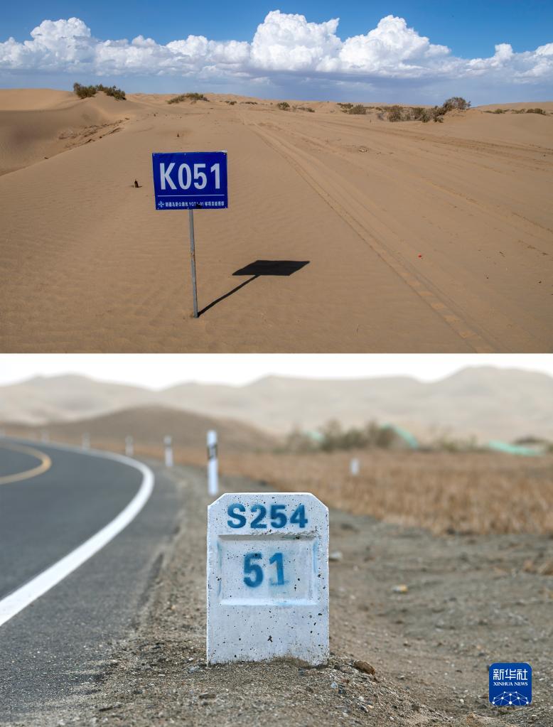 拼版照片:上图为2018年7月5日拍摄的尉犁至且末沙漠公路由北向南约51公里处建设中的路段(新华社记者胡虎虎摄);下图为2022年6月26日拍摄尉犁至且末沙漠公路由北向南约51公里处建成的路段(新华社记者李响摄)。