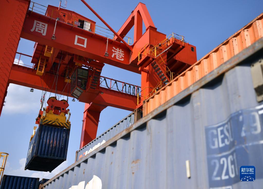 6月28日,工人操作机械设备在周口中心港码头进行吊装作业。