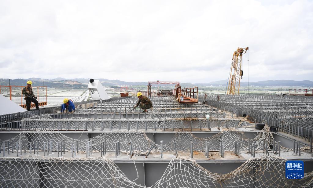6月30日,工人在广东汕头牛田洋特大桥上施工作业。