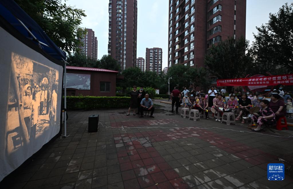 在天津市津南区北闸口镇泽惠园社区,居民在观看电影《地道战》(6月29日摄)。