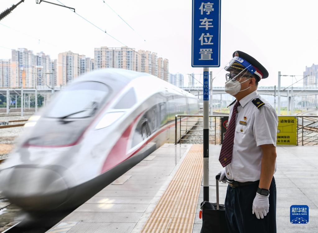 2020年12月24日,司机李治刚按响风笛,驾驶G8608次复兴号动车组,由重庆沙坪坝站开往成都东站。时速350公里的复兴号动车组,让两地间的高铁通达时间缩短至62分钟。