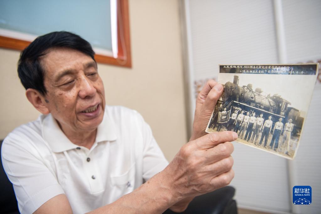 6月29日,在重庆西动车所,李治刚的父亲李国方手拿老照片,讲述成渝铁路列车的故事。