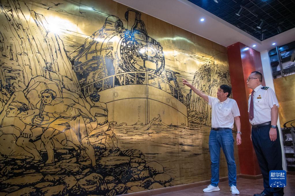 6月29日,在重庆机务段荣誉陈列室,李治刚(右)与父亲李国方在一幅画作前回忆爷爷李鸿升讲述的成渝铁路通车时的故事。