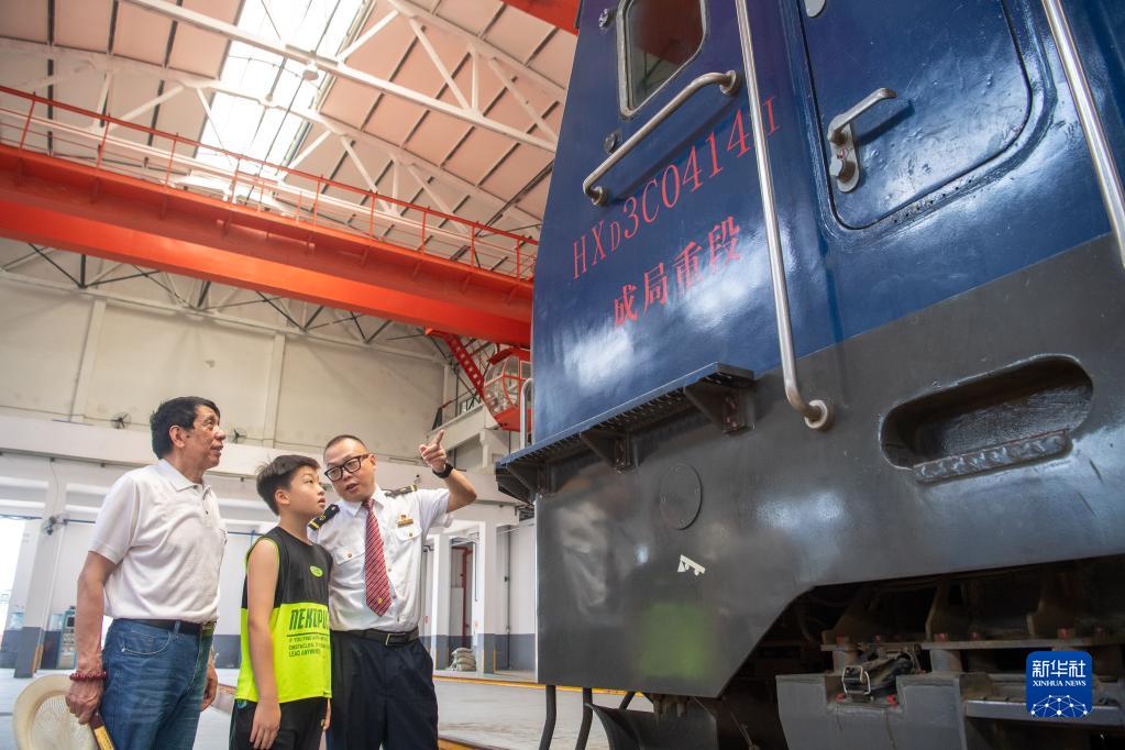 6月29日,在重庆机务段检修库,李治刚(中)为儿子李欣辰介绍成渝铁路的故事。
