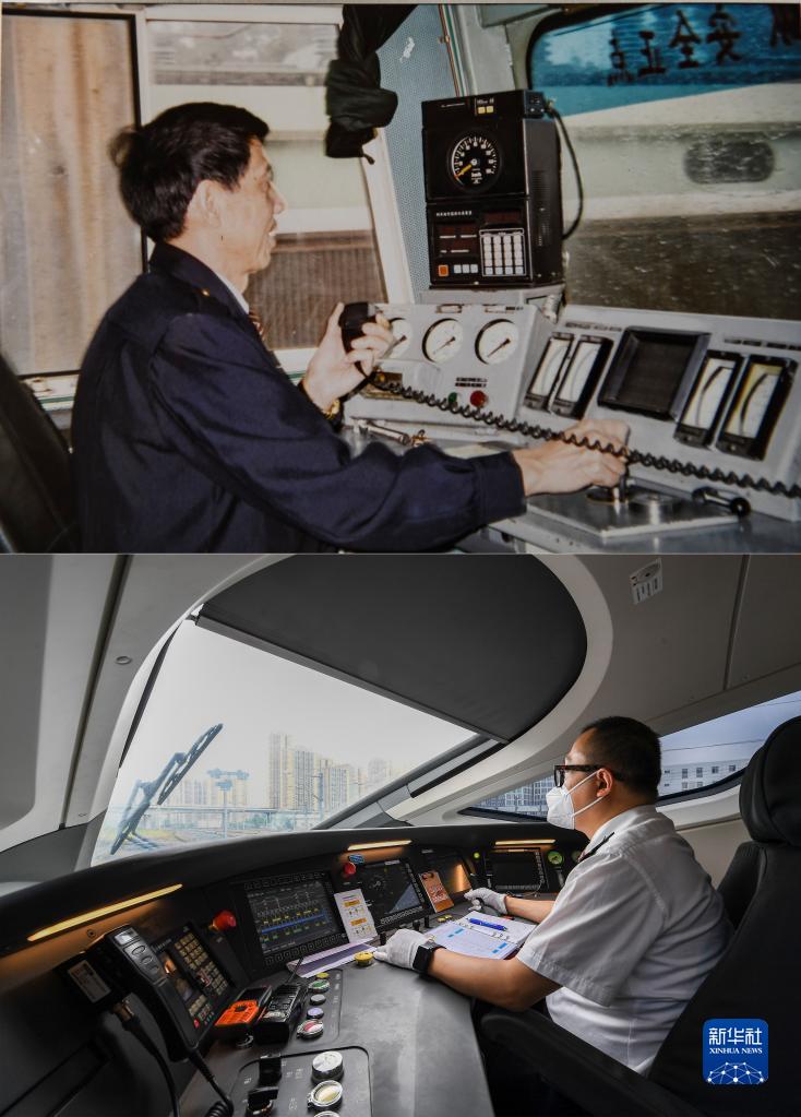 拼版照片:上图是李国方在重庆西机务段SS3型电力机车上操作(翻拍照片);下图是6月24日,李治刚驾驶复兴号动车组由成都东站开往重庆沙坪坝站。
