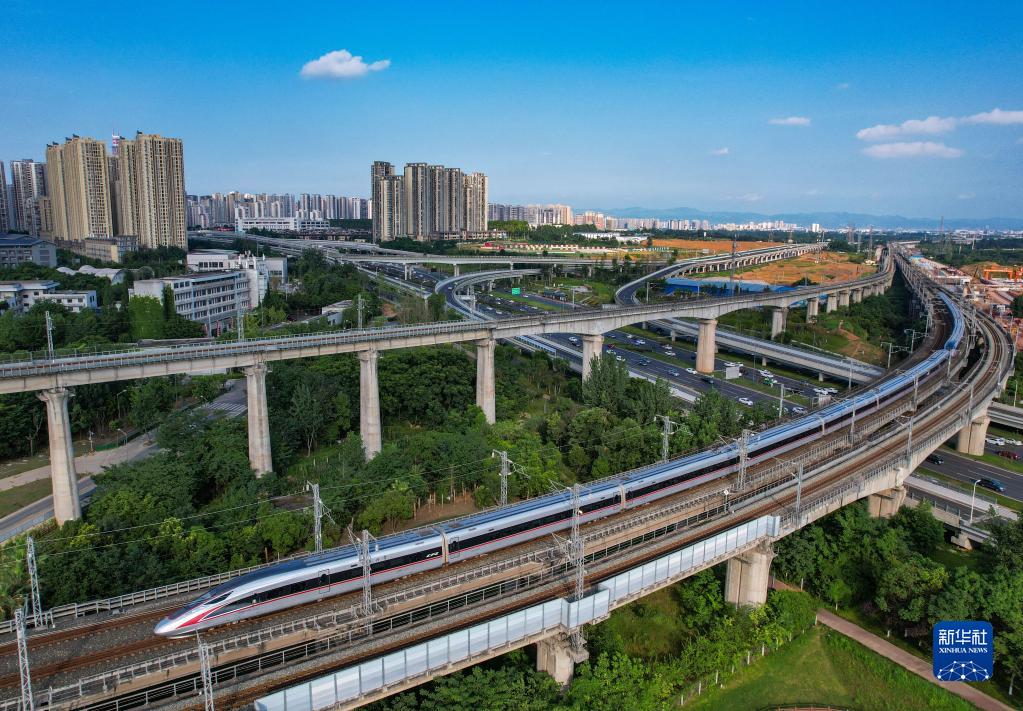 6月24日,复兴号动车组行驶在成渝城际铁路上(无人机照片)。