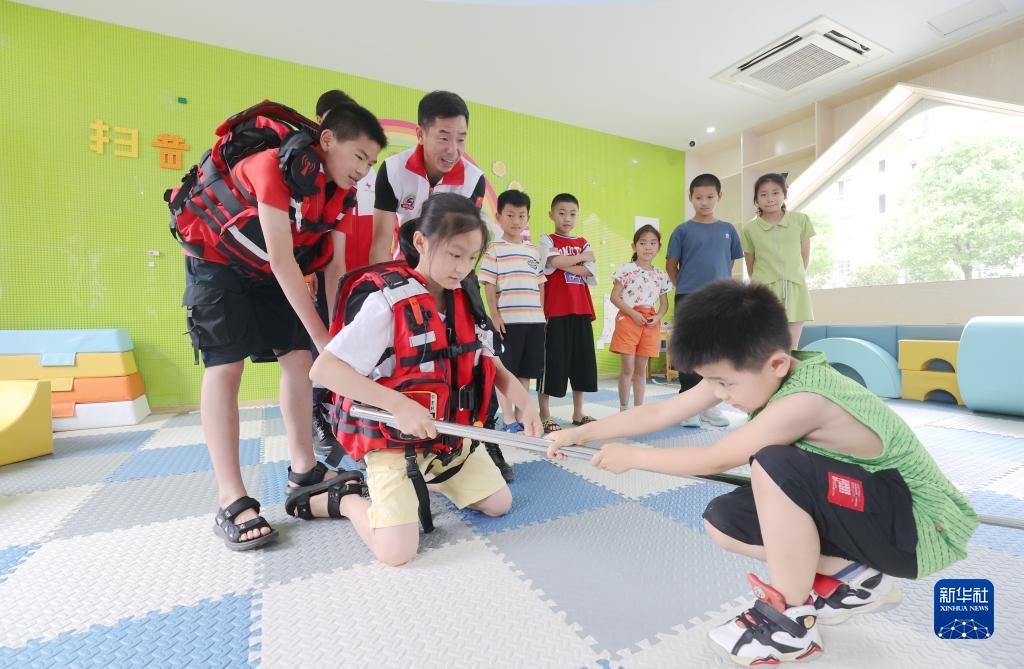 6月30日,在浙江省湖州市德清县阜溪街道狮山社区博爱家园,孩子们在红十字志愿者指导下学习水域救援伸缩杆使用方法。