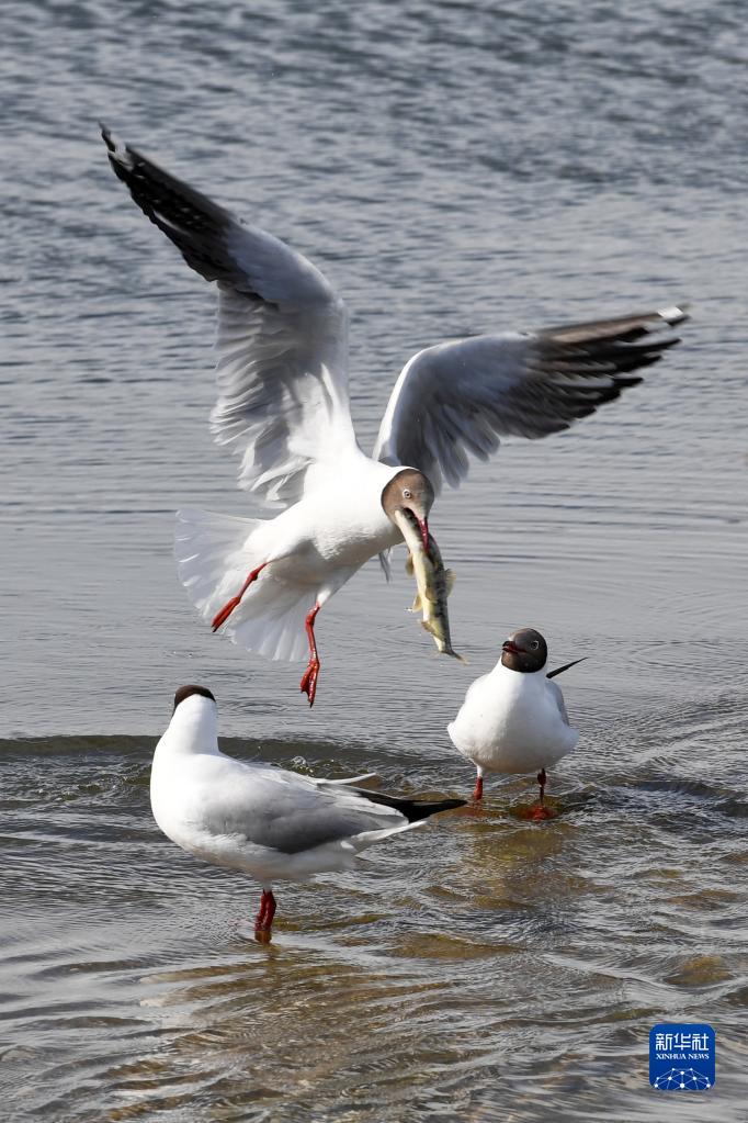 6月29日,在刚察县泉吉河内,一只棕头鸥捕捉到湟鱼后飞离水面。