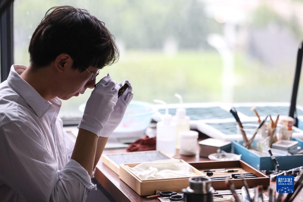 7月1日,袁建在位于贵州大学国家大学科技园的工作室用放大镜查看钢笔的笔壳成品。