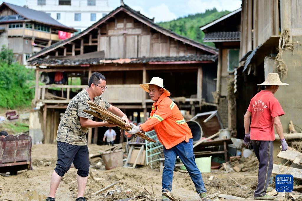 6月29日,在从江县丙妹镇龙江村,党员志愿者贾仕先(左一)搬运被洪水冲毁的房屋木板。