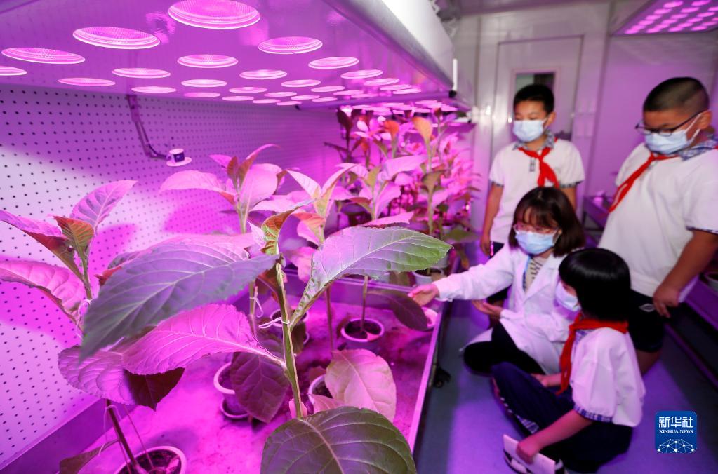 7月1日,中国农科院青岛特种作物研究中心试验基地实验室的工作人员为小学生讲解植物的光照原理。