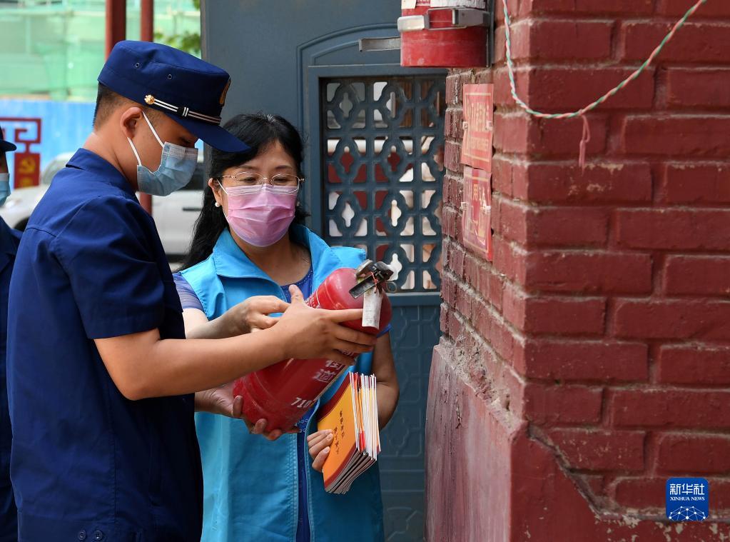 6月29日,张冬香(右)与消防救援人员在社区排查安全隐患。成丰路社区定期与辖区消防部门开展消防安全检查活动。