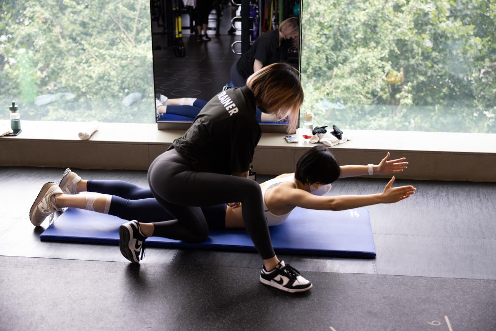 7月1日,在上海外滩金融中心一处健身房,李慧在指导会员进行训练。