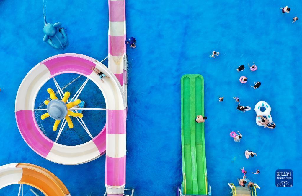 市民在位于南昌市湾里管理局的保利冰雪水世界戏水游玩(7月1日摄,无人机照片)。