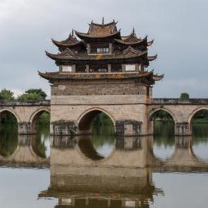 7月1日,游客在云南红河建水县双龙桥参观拍照。