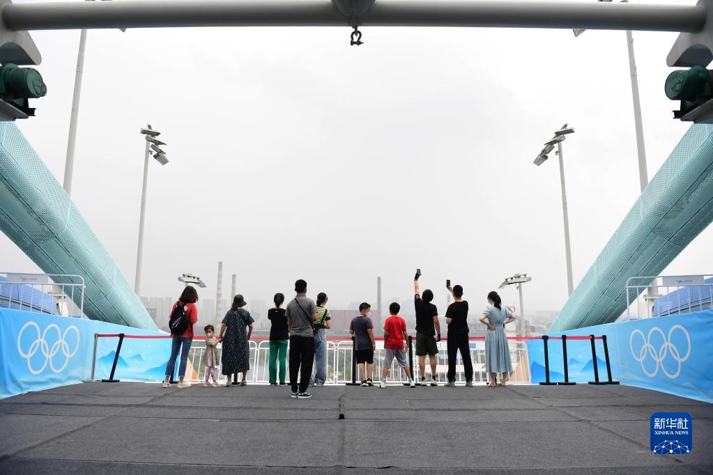 7月2日,游客在北京首钢滑雪大跳台出发区参观拍照。