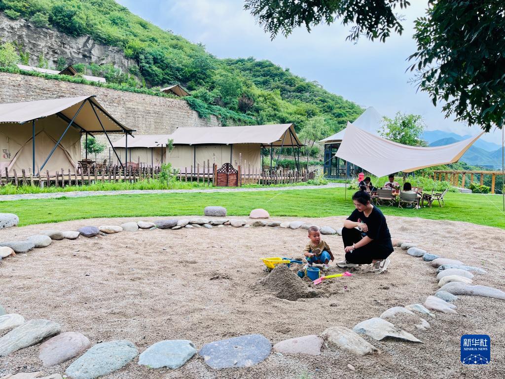 7月2日,游客带孩子在野三坡景区露营基地的娱乐区玩耍。