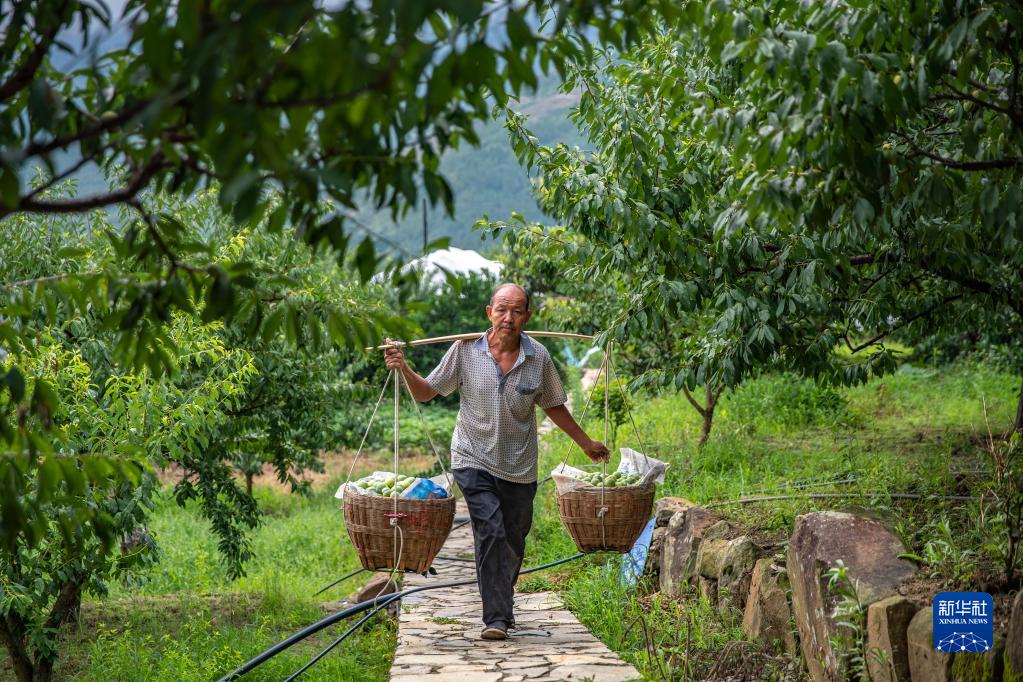 7月2日,在重庆市巫山县曲尺乡柑园村,村民挑运采摘的脆李。