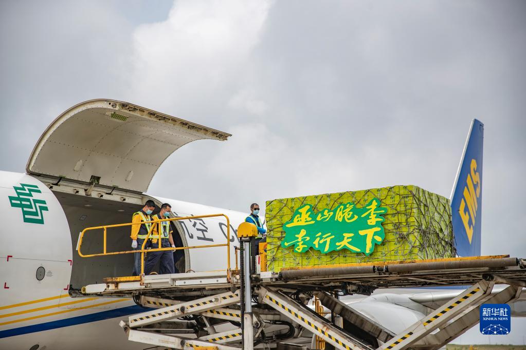 7月2日,在重庆巫山机场,机场工作人员将打包好的巫山脆李运送至中国邮政航空公司的全货机装机。