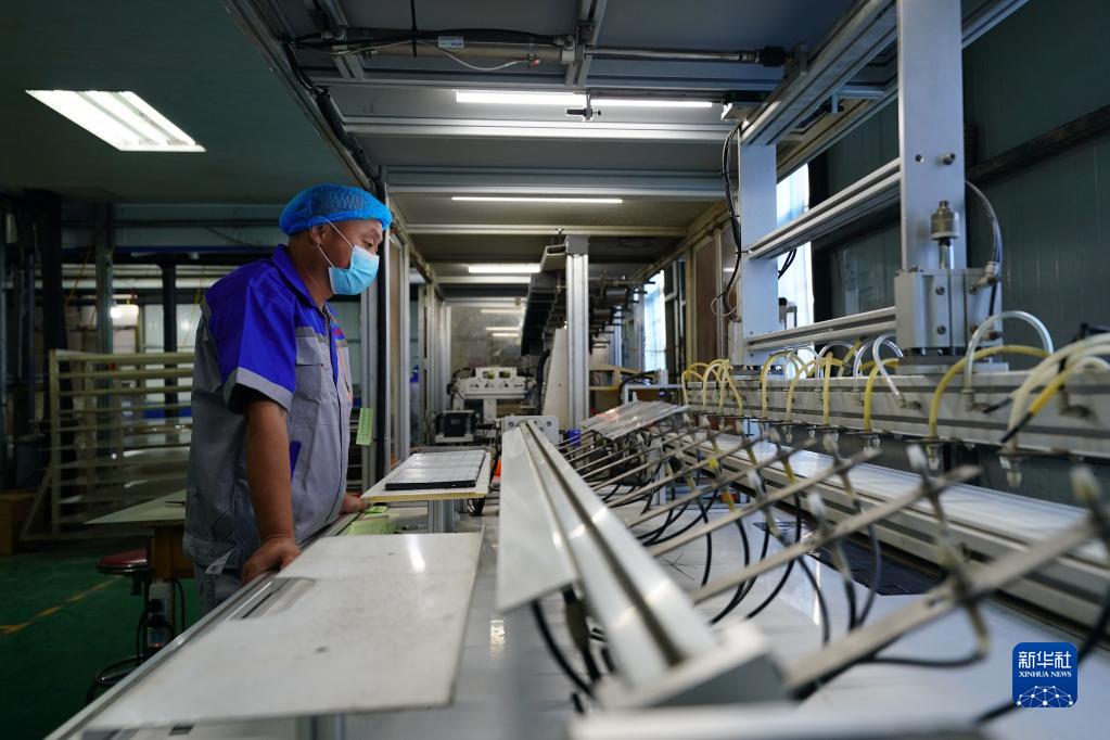 7月2日,在嘉盛光伏科技有限公司,工人在电池片生产线上忙碌。