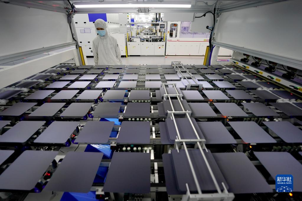 7月2日,在晶澳太阳能有限公司,工人在检查生产线上的硅片。