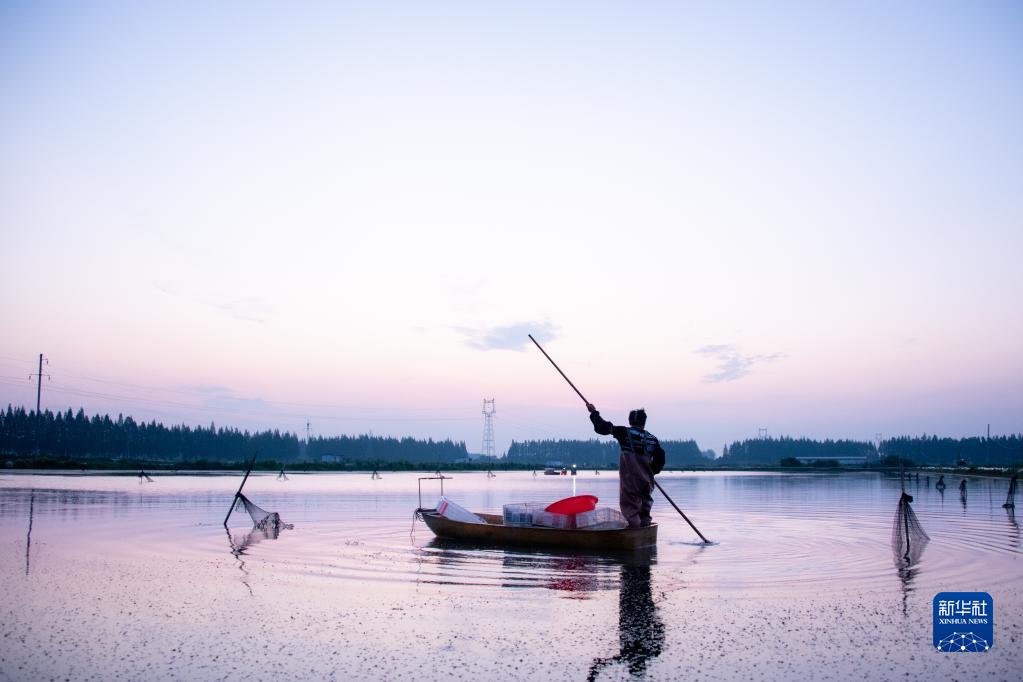 6月25日,在湖北潜江市后湖农场天新场分场,虾农捕捞小龙虾。经过20多年发展,全市虾稻共作面积85万亩,虾稻综合产值超600亿元,从业人数超20万人。
