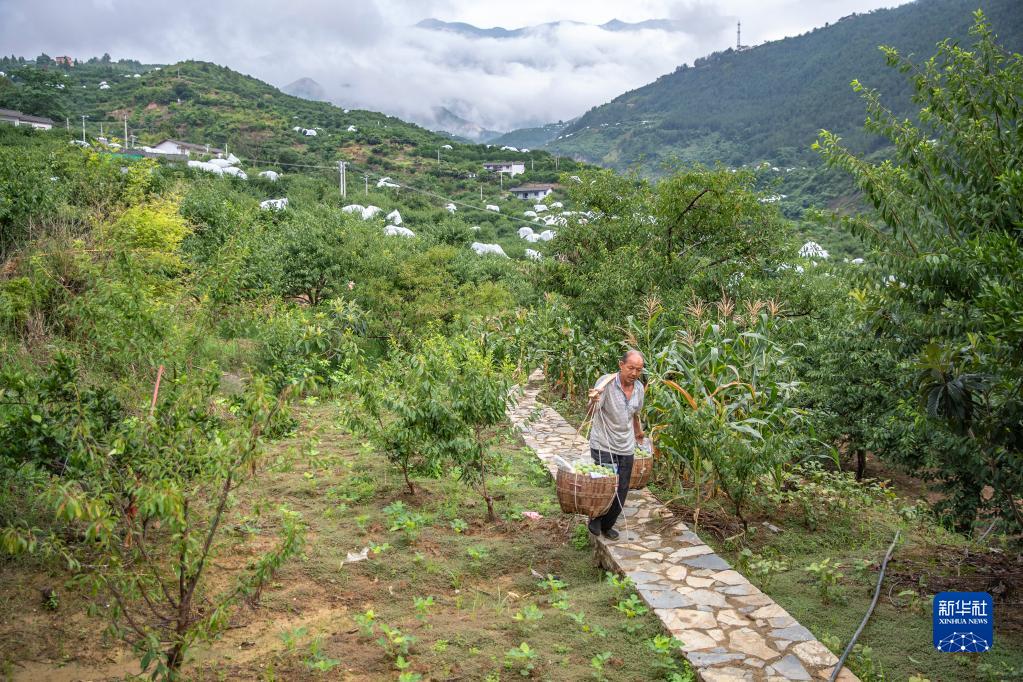 7月2日,果农张兴前在重庆市巫山县曲尺乡柑园村挑运刚采摘的脆李。