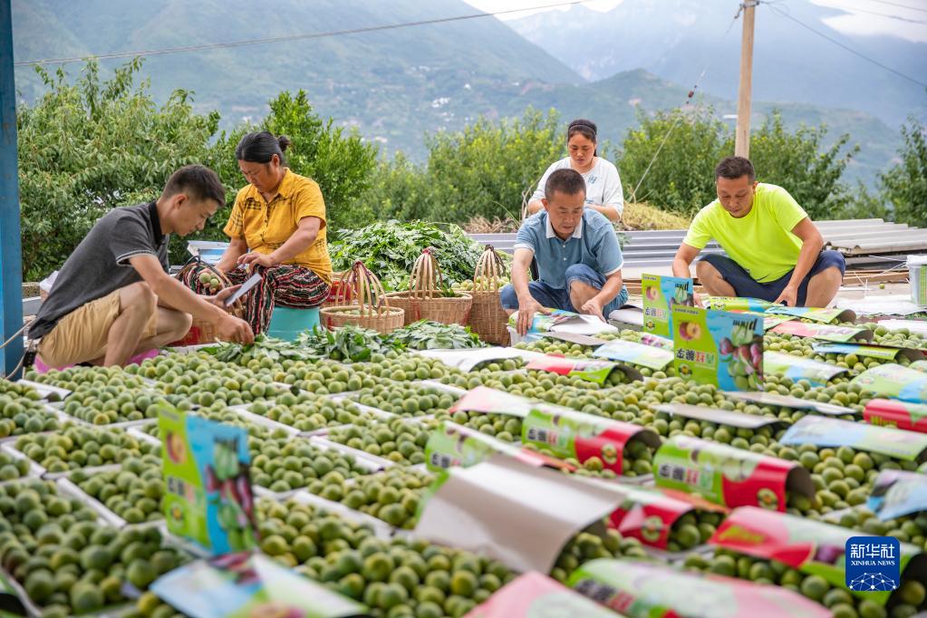 7月2日,在重庆市巫山县曲尺乡柑园村,果农对当天采摘的脆李进行分级包装。