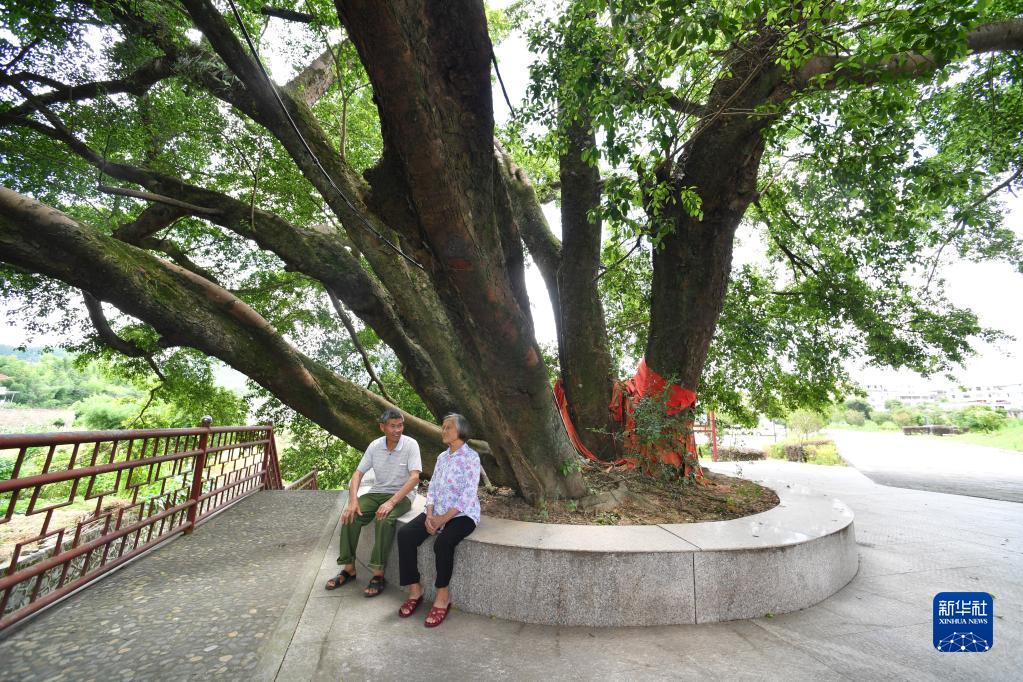 才溪镇发坑村两位老人在“红军榕”下乘凉(6月29日摄)。