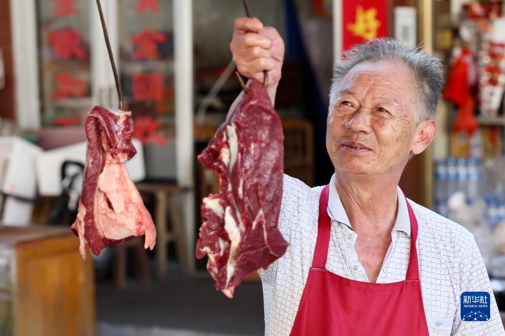 才溪镇居民钟先生在农贸市场摆肉摊(6月29日摄)。
