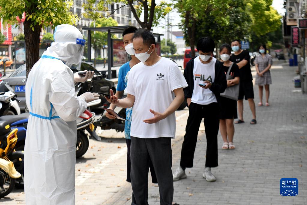 7月3日,在安徽省宿州市泗县虹城街道一小区,居民排队等候接受核酸采样。