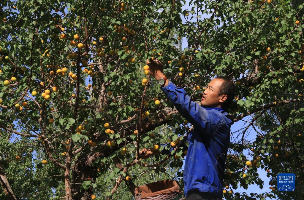 7月3日,敦煌市月牙泉镇合水村农民在采摘李广杏。