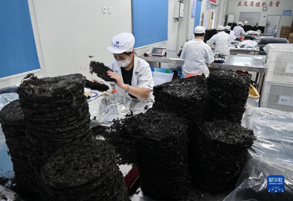 6月23日,霞浦县的福建皓大工贸有限公司女工在车间包装紫菜。