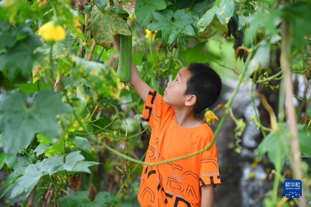 7月4日,在湘潭市先锋街道桐梓村的农耕文化体验基地,小朋友在采摘丝瓜。