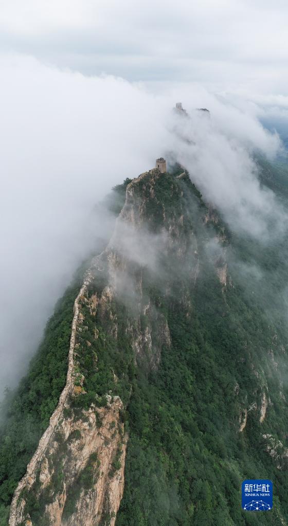 云雾中的长城仙女楼(近)、望京楼(远)(7月4日摄,无人机照片)。