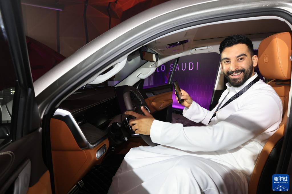 7月3日,在沙特阿拉伯首都利雅得的发布会上,一名男子体验“坦克”品牌汽车。