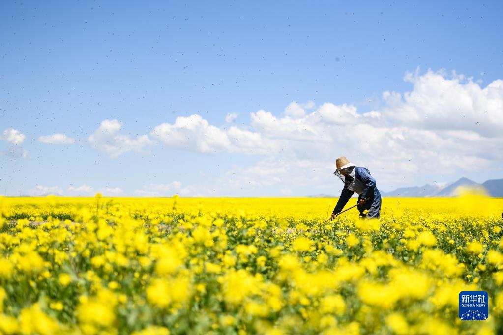 进入七月,位于青海省海北藏族自治州门源回族自治县的万亩油菜花竞相绽放。来自四川德阳的蜂农冯跃宣在花海里忙碌。他从早上7点开始整理蜂箱、采集花粉、晾晒花粉,一直忙碌到晚上8点。